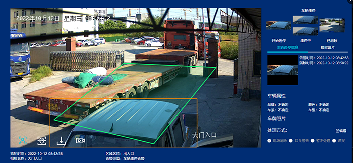 Violation detection: The AI intelligent box detects the situation of vehicles parked in areas that violate the line in the picture, and provides location information. The picture shows an alarm for vehicles parked illegally at the factory entrance and exit;