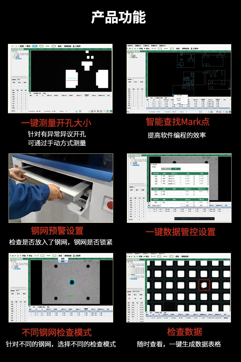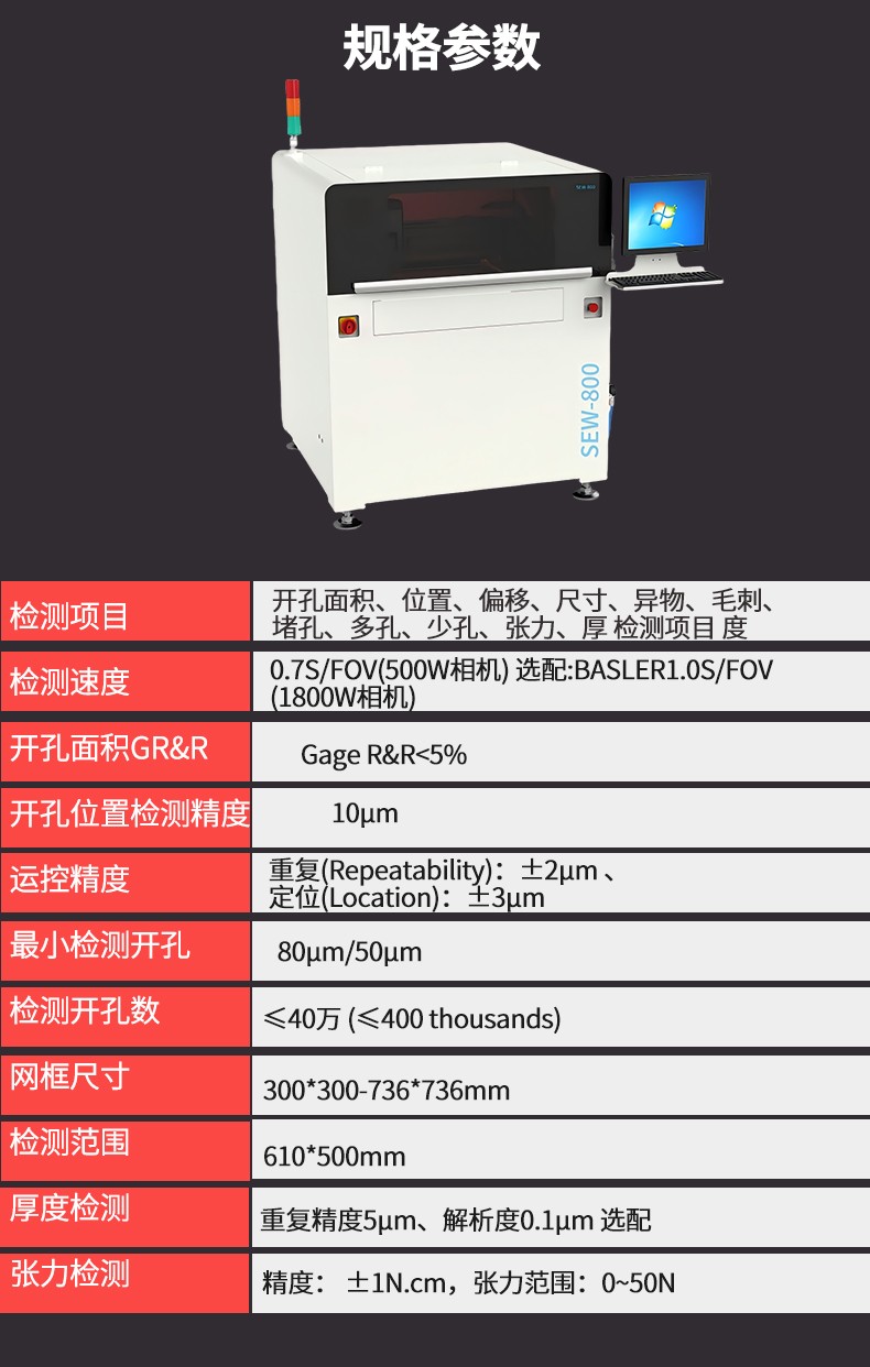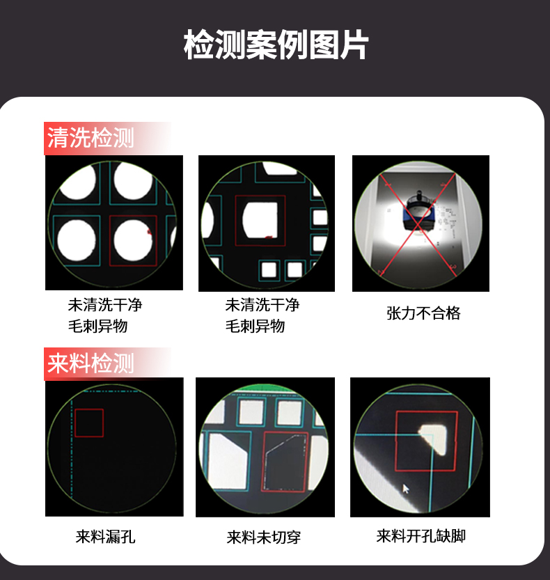 檢測性能 | 檢測項目 | 開孔面積、位置、偏移、尺寸、異物、毛刺、堵孔、多孔、少孔、張力、厚度 |